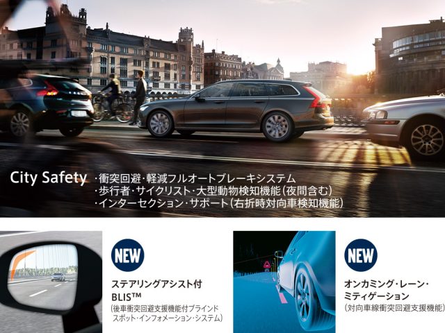 ●ボルボの先進安全・運転支援機能は、ドライバー自身による安全運転を前提としたシステムです。事故の回避や被害の軽減および運転負荷の軽減を目的としています。交通・天候および路面状況によりシステムが作動しない、または所定の性能を発揮しない場合があります。いかなる時もシステムに頼った運転は避け、ドライバー自身により必要に応じたステアリング、ブレーキ等の操作を行ってください。これらのシステムをご使用の際には必ずオーナーズマニュアルをお読みください。 ■CitySafetyの作動速度範囲は車速4〜200km/h(歩行者・サイクリスト検知機能は4〜80km/h)です。前走車や歩行者・サイクリストとの衝突の危険が迫り、ドライバーがブレーキ操作を行わない場合、最大の制動力で自動ブレーキが作動します。自車と前走車との速度差が50km/h以下の場合および、自車と歩行者・サイクリストとの速度差が45km/h以下の場合、衝突の回避をアシストし、速度差がそれよりも大きい場合は、衝突被害の軽減を図ります。 ※大型動物検知機能は支援機能であり、状況によっては大型動物を検知できない場合があります。たとえば、体の一部が隠れている大型動物、真正面または真後ろにいる大型動物、動きが速い大型動物、犬やイノシシ・シカなど小型の動物の場合は検知できません。検知可能な最小の動物の大きさは、体高、体格および輪郭により異なります。